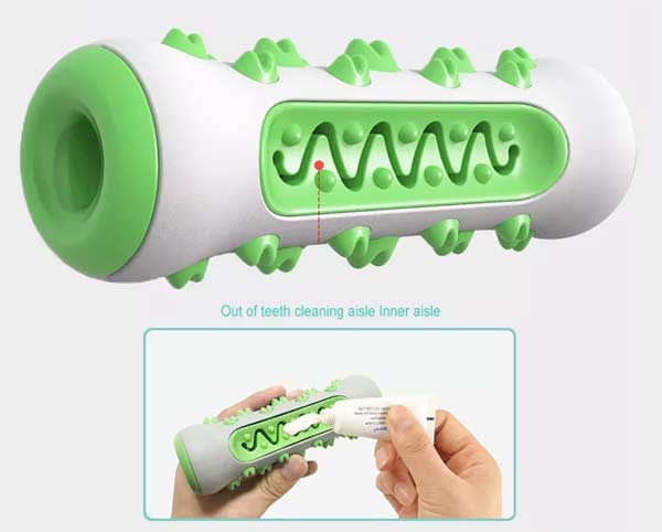 Votel kanal v sredini igračke je namenjem temu, da ga napolnite s priboljški ali s pasjo zobno pasto.